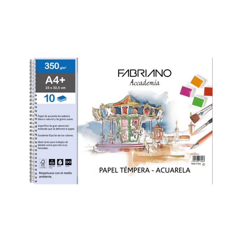 10 hojas de 23 x 32.5cm (A4+) Papel de acuarela Accademia, blanco natural de grano suave de 350 g/m2 para técnica húmeda. Superficie de gran absorción evitando que se deforme el papel. Excelente fijación de los colores y óptimo archivo. Ideal para acuarela, témpera, gouache, aguada y acrílico.