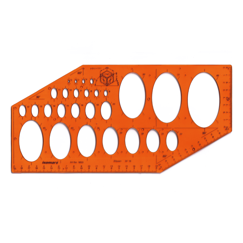 Plantilla de elipses isométrico. 25 elipses con ejes de 4 a 65mm, relación de los ejes: 1 :1,7(35º16'). Dimensión: 295 x 150 x 1,2 mm. Hecho de plástico transparente y naranja. La tasa de transparencia permite ver el medio de dibujo debajo de la plantilla para una fácil colocación. De alta calidad, un artículo totalmente nuevo entregado en un estuche de plástico deslizante para un fácil almacenamiento y protección contra los rayones. Ideal para realizar dibujos, planos y cualquier otro trabajo que requiera máxima precisión. Hecho en Alemania.
